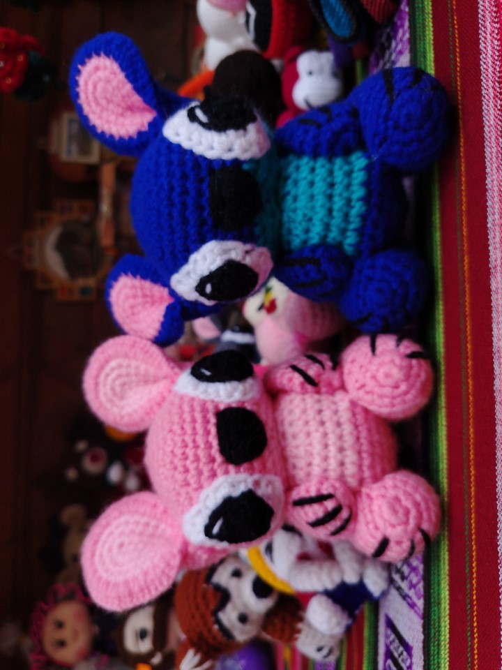 Personaje de Stitch tejido a mano en hilo azul con detalles bordados.