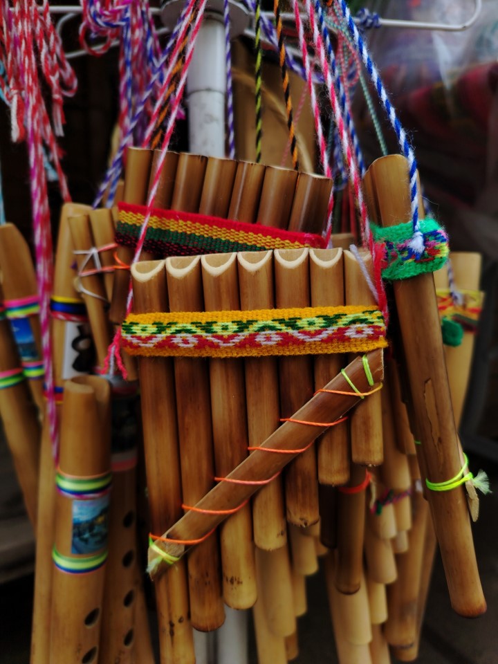 Instrumento de viento tipo antara fabricado con tubos de caña seleccionados.