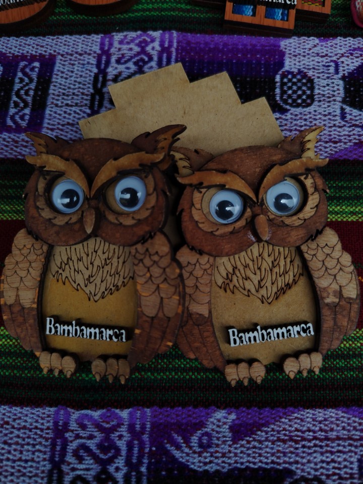 Imán decorativo para refrigeradora en forma de búho con acabados artesanales.