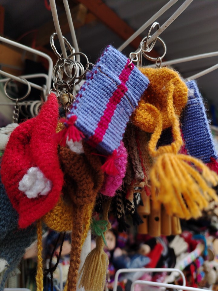Llaveros tejidos con diseños tradicionales y colores vivos.