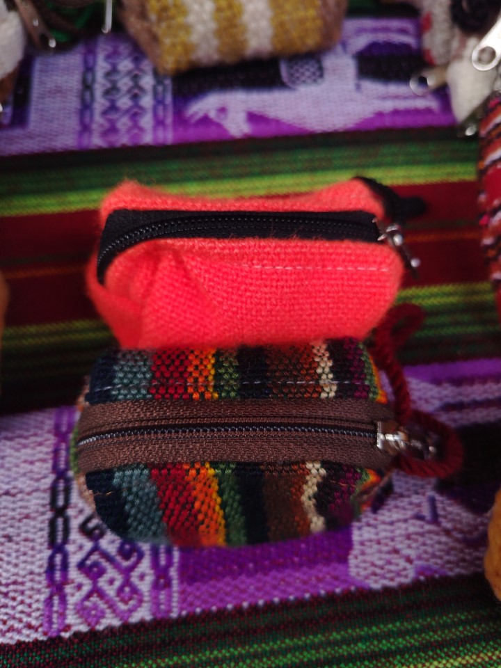 Monedero pequeño tejido con franjas de colores vibrantes y cierre café.