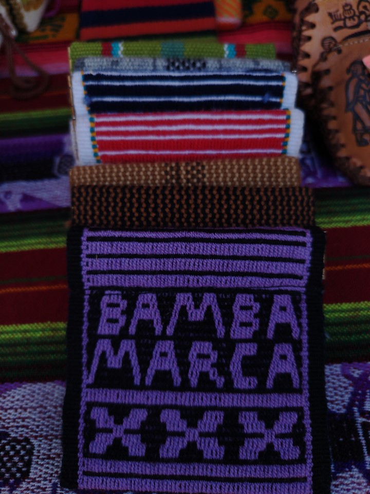 Monedero tejido con diseño regional y patrones geométricos de colores.